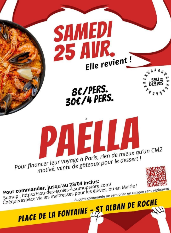 Samedi 25 avril : Paëlla du SOU des Ecoles sur la Place de la Fontaine