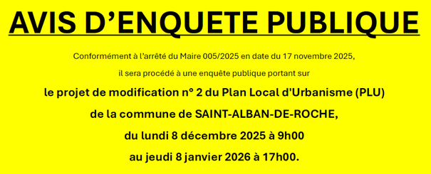 Projet de modification n°2 du PLU : enquête publique du lundi 8 décembre 2025 à 9h au jeudi 8 janvier 2026 à 17h (visualiser l’avis enquête publique)